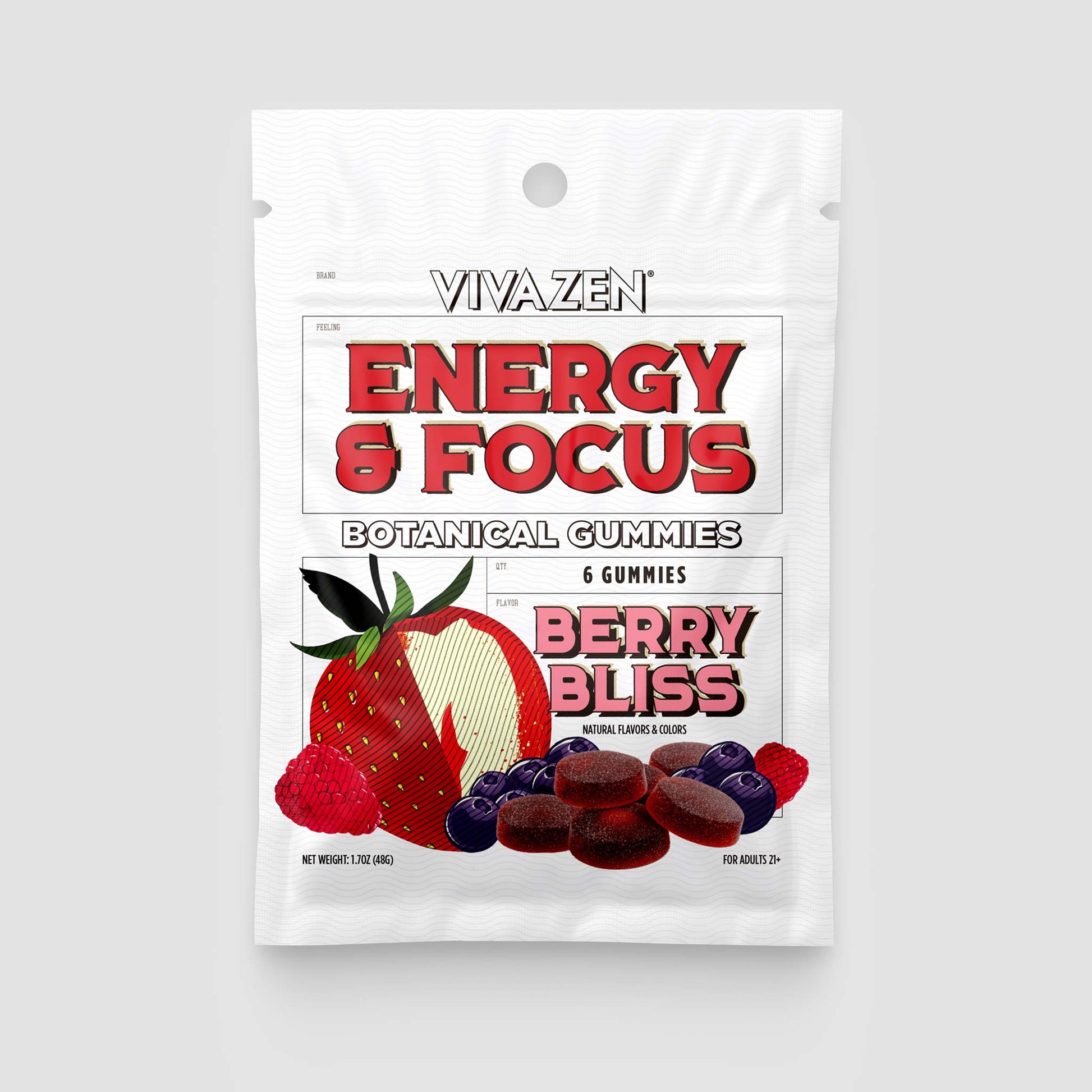 Vivazen® Energy + Focus* Gummies offer function you can feel in a craveable Berry Bliss flavor. Built for busy customers with big goals, this botanical gummy delivers smooth, caffeine-free support for mental clarity, stamina, and productivity.**